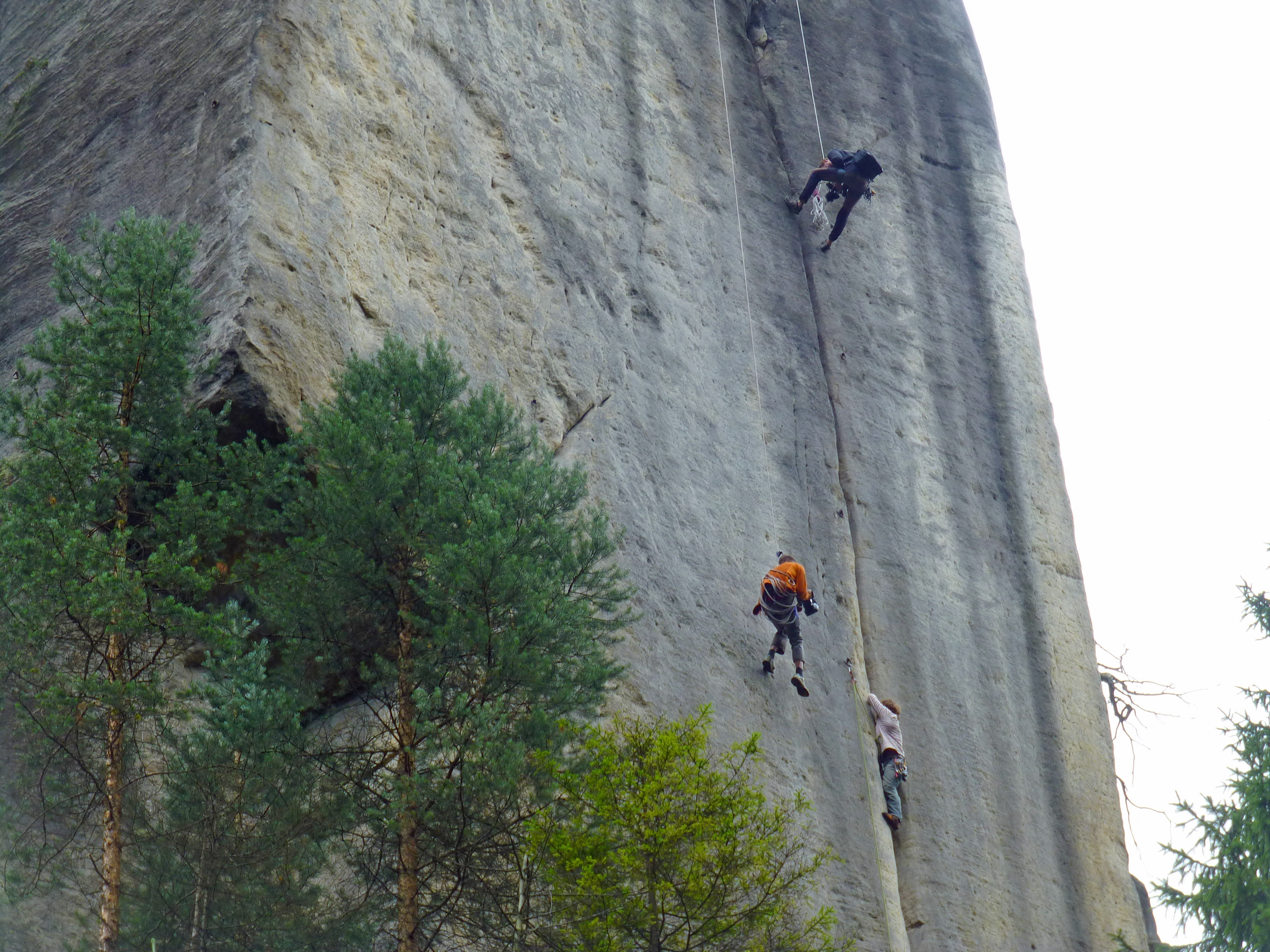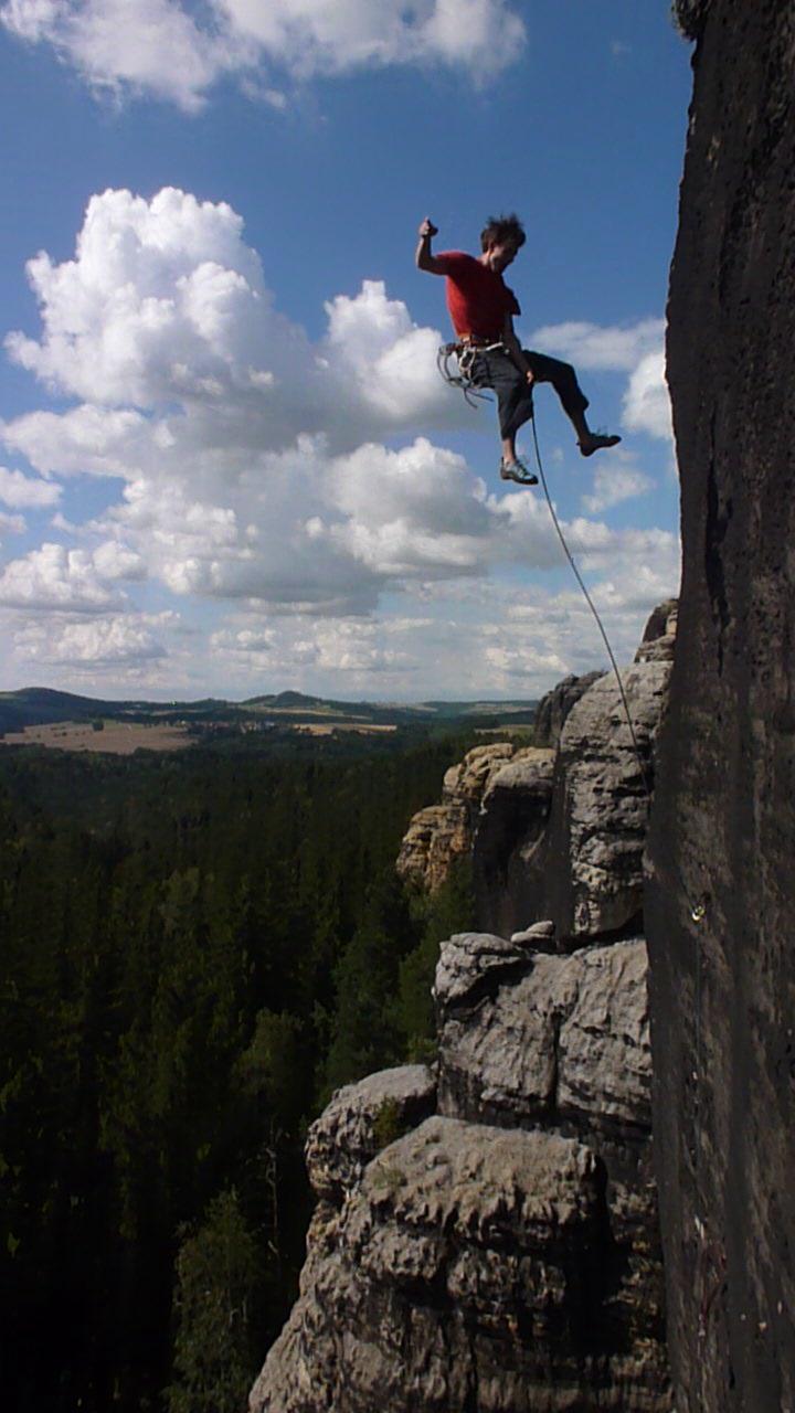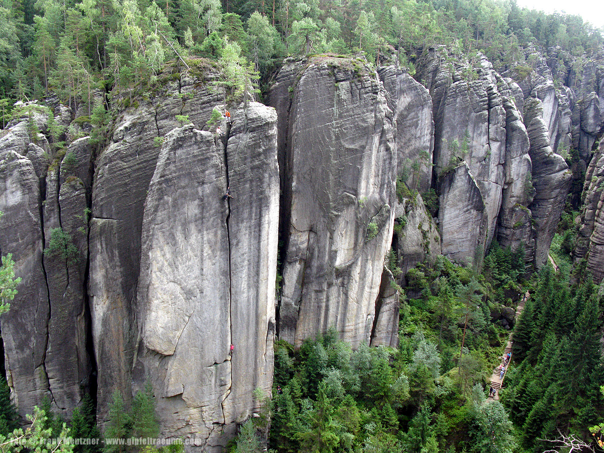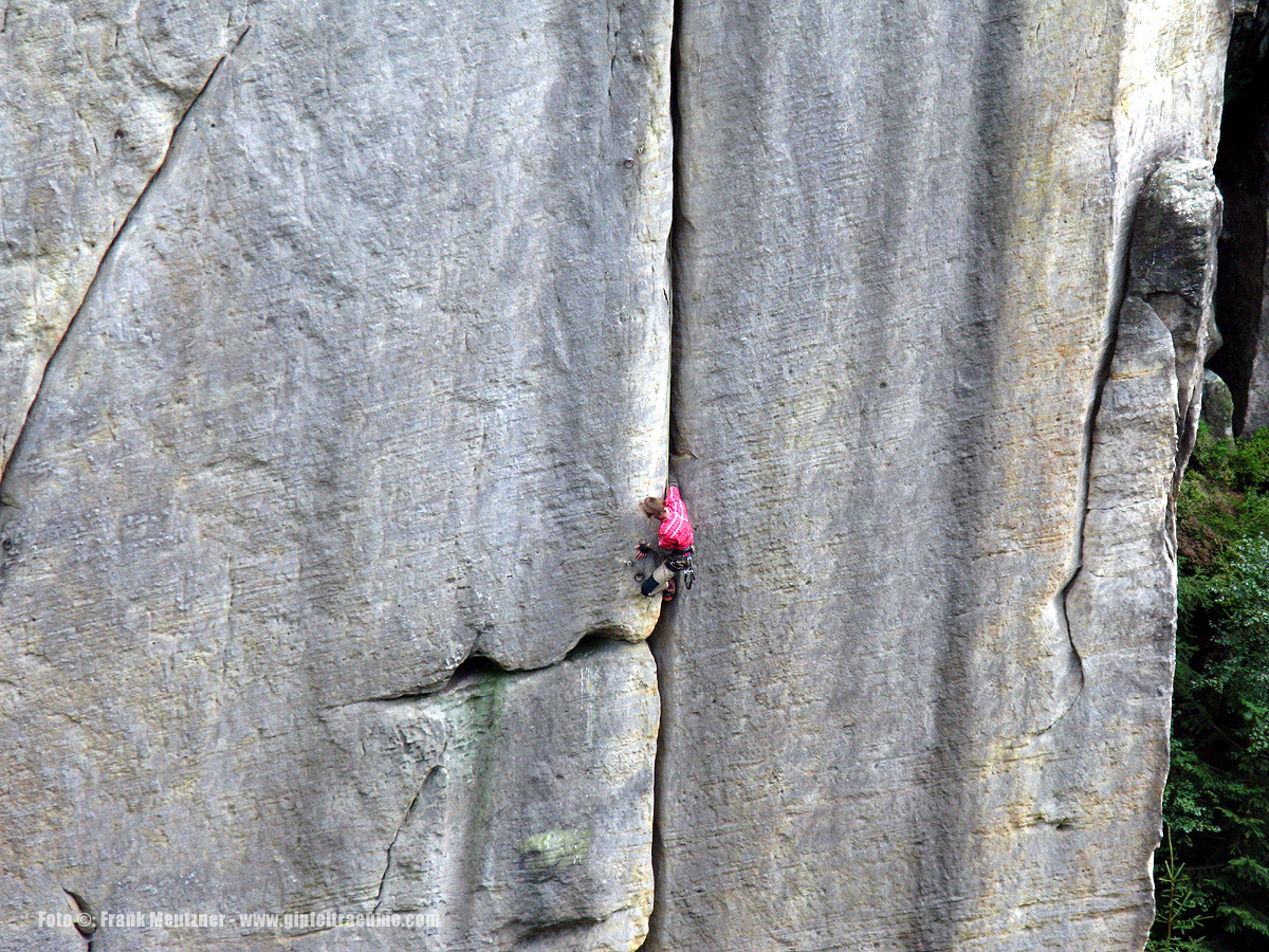 Tatort damals: Der Talriss an der berühmten Hláska im tschechischen Kletter-Eldorado Adersbach-Weckelsdorf, wo der „Riss-Papst“ aus Sachsen vor laufender Kamera des MDR-Magazins BIWAK demonstrierte, wie man nach oben kommt, wenn es schier gar nix zum Festhalten gibt. Klemmen, Rudern, Keuchen... das ist heute nicht anders, wenn man der Hláska auf den Gipfel steigen will.