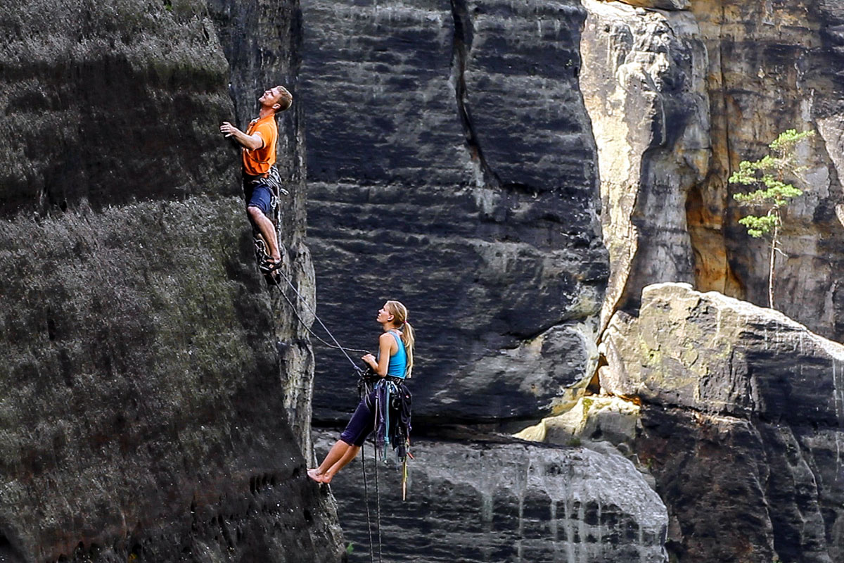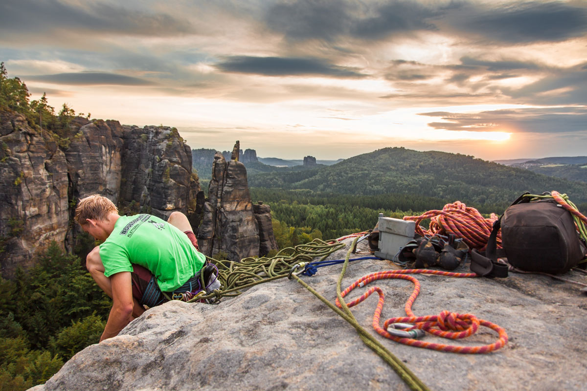 Klettern im Elbsandsteingebirge ist ein unbeschreibliches Erlebnis. Im Geburtsort des Freeclimbing verteilt sich das Gipfelglück auf 1134 freistehende Sandsteinfelsen und eine überwältigende Naturkulisse. Neben der Einmaligkeit der Felsformationen, inmitten des Nationalparks Sächsische Schweiz, sind es die lange Historie und das eigene Regelwerk mit einer speziellen „sächsischen“ Schwierigkeitsskala, die das Klettern hier so besonders machen. Wer hier einmal einen Gipfel erklommen hat, kann sich dem Zauber dieser Kletterregion nicht mehr entziehen.