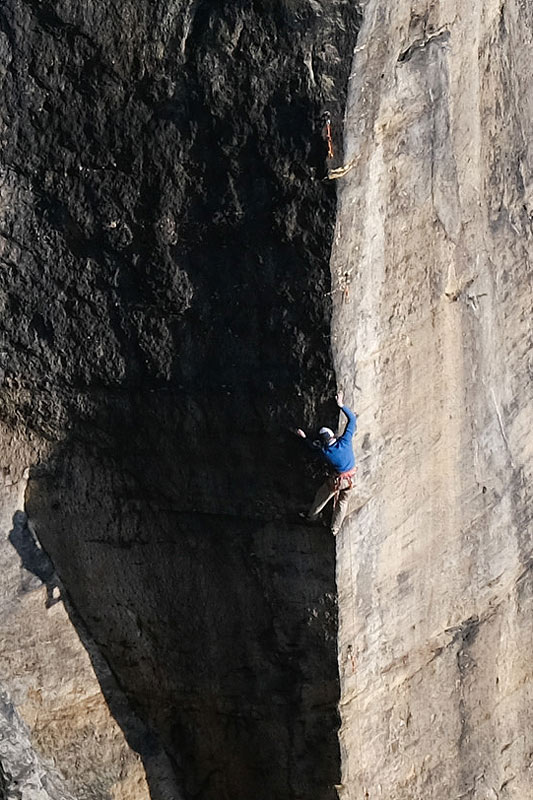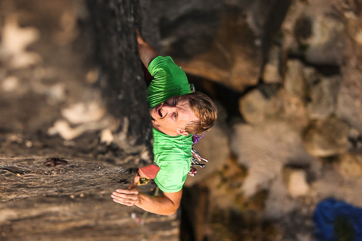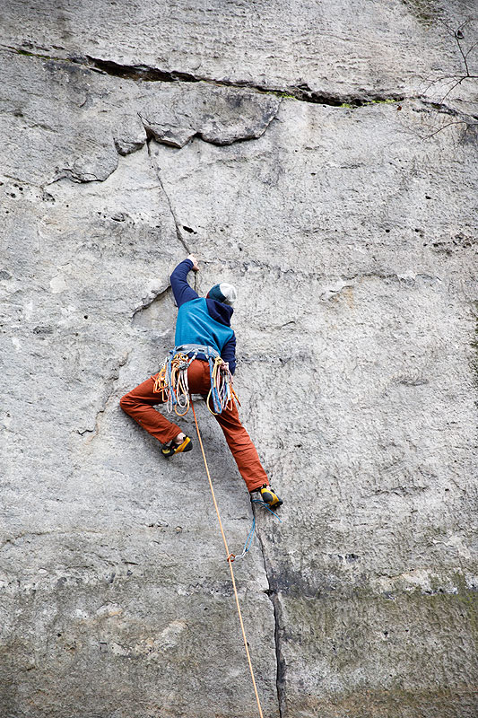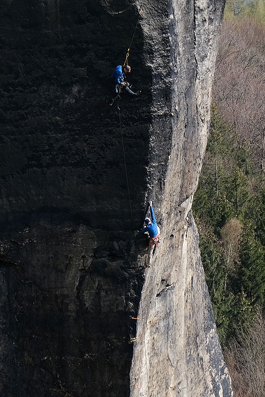 Sieben Meter über dem letzten Ring stellt die Schlüsselstelle dieser Route eine erhebliche mentale Herausforderung dar. Richard Wetzel aus Dresden hat sich dieser Herausforderung gestellt... !
