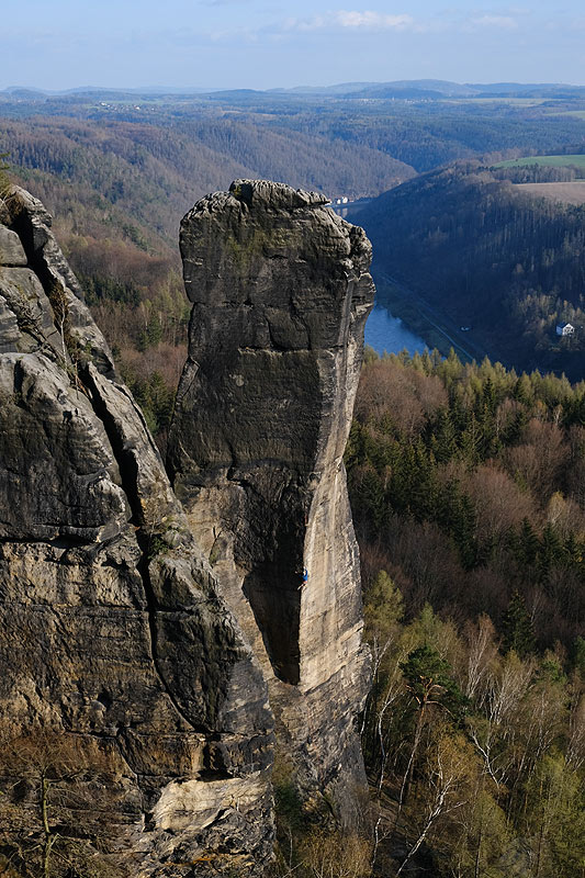 Viele Kletterwege in der Sächsischen Schweiz erfordern nicht nur Kraft, sondern auch Nerven. Das gilt insbesondere für die sogenannten „Meisterwege“. Das „Lineal“ am Meurerturm, 1970 von Bernd Arnold erstbegangen, Schwierigkeit IXa, ist ein solcher Weg.